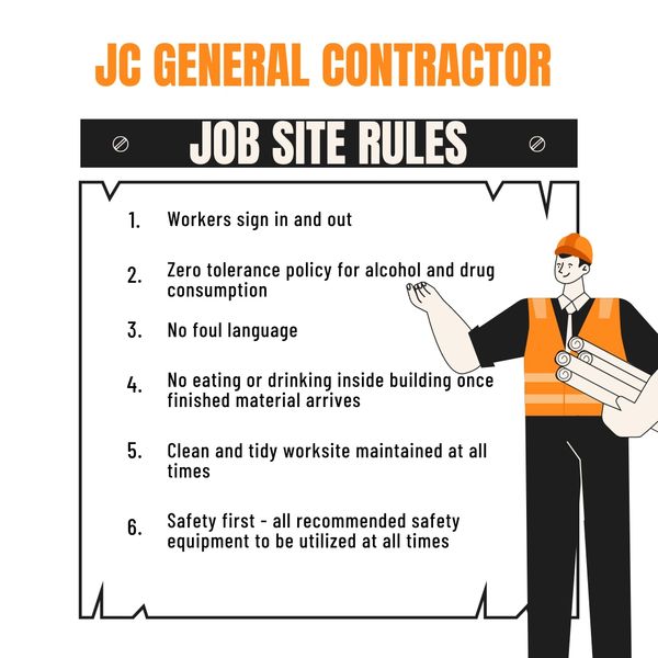 I want to make sure to share the rules of the job site to make you feel at ease with how serious we are about safety not just for the employees, but for our work site as well. These rules are meant to protect our workers and our clients during the process of our work. We make sure to maintain professionalism every step of the way. At JC General Contractor we pride ourselves in our exceptional customer service, attention to detail, and safety in the worksite. We follow these job site rules and expect the same from all our employees in order to get the job done safely and efficiently.